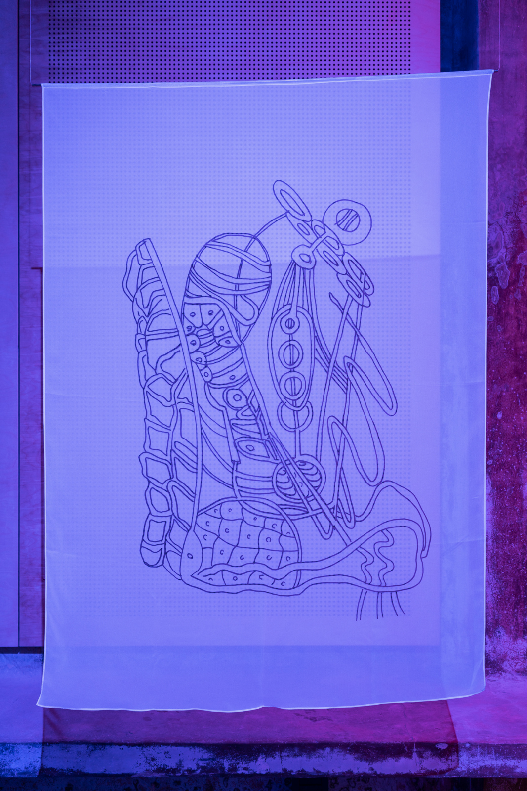 In the exhibition NETS OF HYPHAE, Diana Policarpo departs from the study of the ergot fungus as a historical catalyst, for both its intoxicating and healing properties. In the exhibition, ergot outlines genealogies of feminine knowledge and struggle throughout centuries, and it valuably elucidates on the subjugation of women’s bodies for the consolidation of capitalism as a totalising regime, encapsulating economic, social, and cultural structures. Through an array of video, work on paper, sound, and light, Policarpo lays out a sensorial schema that offers a synesthetic experience of the ergot mushroom as a storytelling device, with its multiple hyphae as narrative arcs that disseminate accounts of feminist resistance.