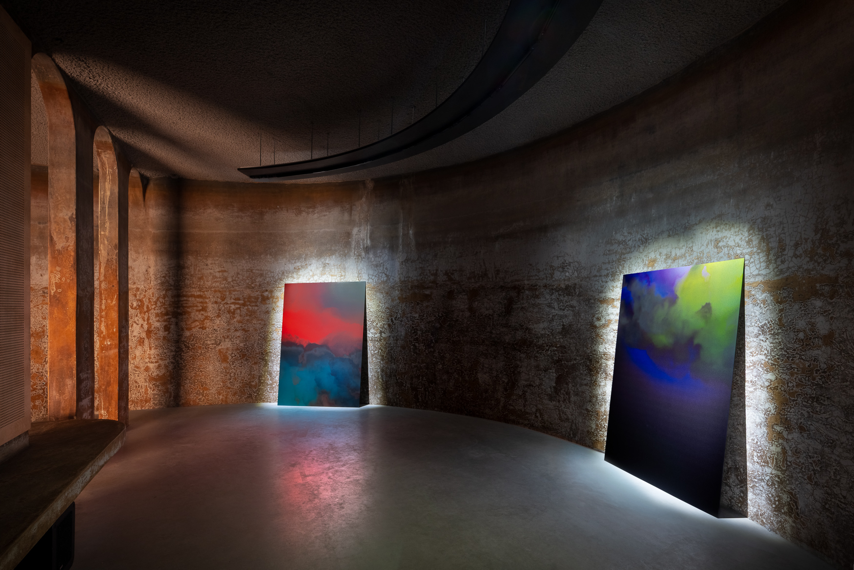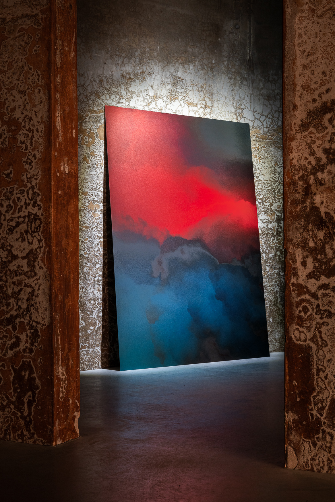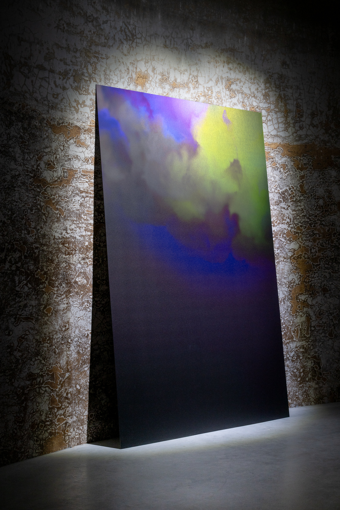 Furthering the journey to deep time and millenary geology, Gil also presents a series of heliographs belonging to the series Vortex (2025–ongoing). They consist of images of the interior of Icelandic hydrothermal volcanoes captured by means of heliography: an early photographic technique that uses sunlight exposure to capture images on a metallic sheet varnished with bitumen (a byproduct of oil). Deep in the Eyjafjörður fjord of Iceland, submarine volcanoes emit steam in a seascape hidden from human perception. Often located near tectonic plates, submarine volcanoes are geological witnesses that harbour extreme, dark ecosystems powered by chemosynthesis. Rising from the abyssal plains, the volcanoes are deep time formations from the roaring Earth crust. Despite the difficulty in approaching them, they are increasingly targeted for the exploitation of mineral resources, renewable geothermal energy, and scientific research. New frontiers for the energy sector and capitalism’s new commodities are being speculated on one of the oldest geological features on Earth. Treated with thermochromic patinas and printed on steel and copper plates, the heliographs are an alchemical feat: by means of sunlight, they imprint that which sunlight does not reach. Vortex captures the billowing smoke clusters from the volcanoes mixed with colours produced by the lightwave differences in the Icelandic sky. Arresting and cryptic, Vortex approximates us to an aesthetic of deep time.