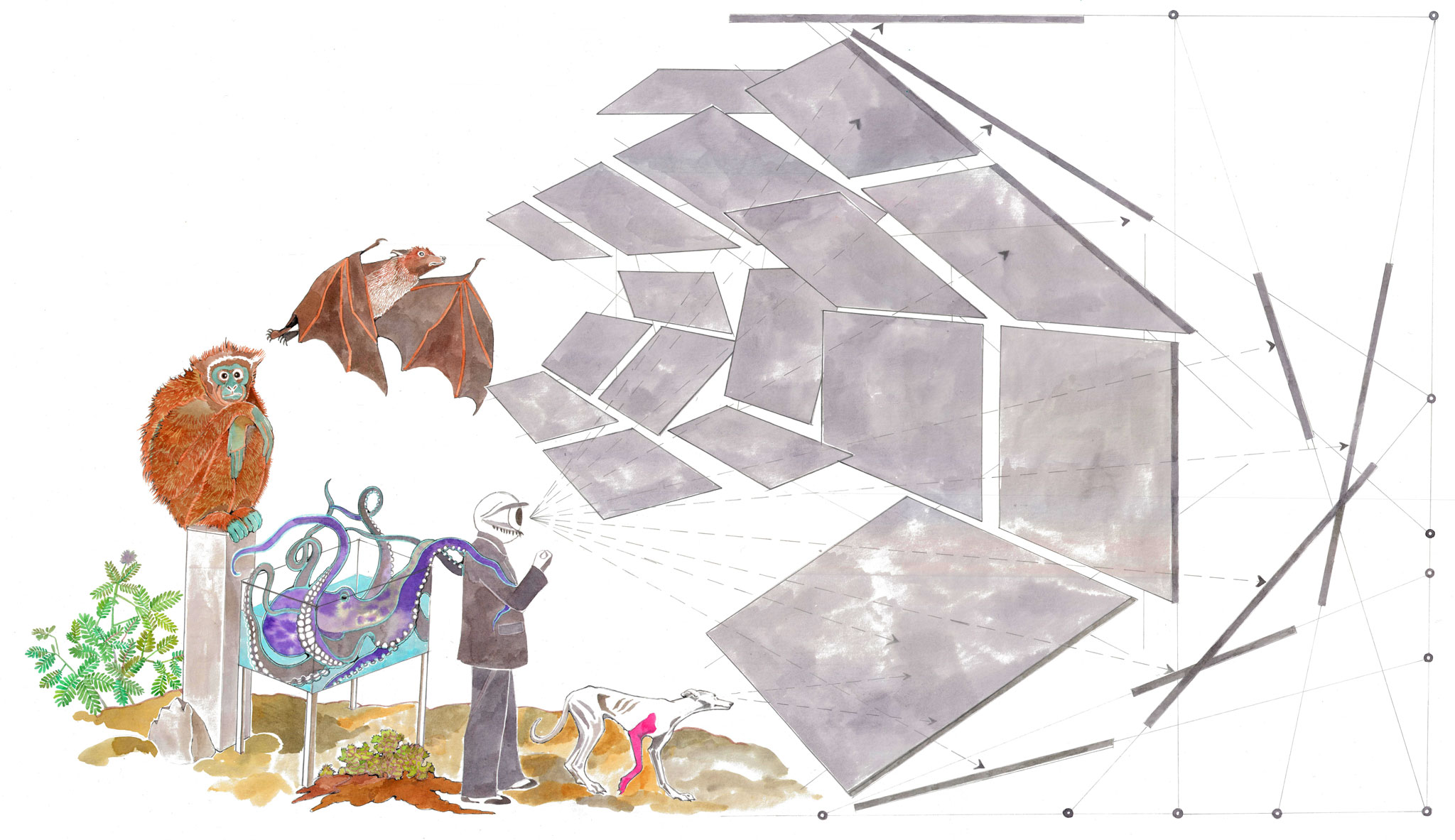 The term naturecultures originates from the feminist scientist Donna Haraway. She introduced the concept to describe the intertwined histories of a multitude of life forms on Earth, to reveal new ways of thinking about agency and power, difference and sociality, forms of existence and knowledge. Naturecultures is a term that arises from the scientific questioning of binaries—including, for example, human/animal, object/subject, and nature/culture—that are deeply rooted in the intellectual traditions of the sciences. The pronounced boundaries and divisions produced within and between scientific fields have led to the separation of humanity and nature, sometimes to the point of exempting humans from fundamental physical properties and laws of nature. The term naturecultures has no clear definition. Rather, it is a vibrant and unruly spectrum of transdisciplinary approaches united by a common argument: approaching and maintaining worlds that are more than human requires a change in the methods and tools with which we study those worlds. In other words, to remove the boundary between nature and culture, a radical mixing of disciplines including art, design, architecture and science is necessary. In this sense, naturecultures is a synthesis of nature and culture that recognizes their inseparability through ecological relationships that are formed biologically, physically and socially.