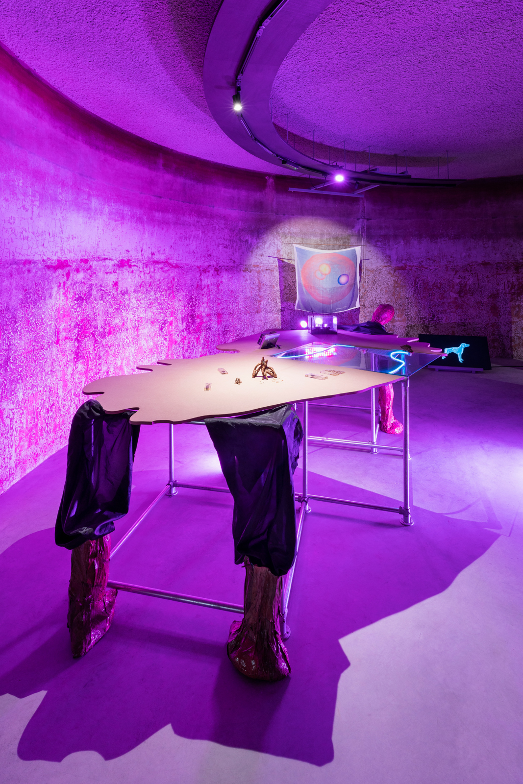 What we were and what we will become are concurrently returned and projected to and from us in an interdependent ebb and flow, in a simultaneous acknowledgement that a rich alterity of water bodies flows through us in an ongoing cycle. The first act of Underland merges the circular spaces of RADIUS, once a body of water itself, in artistic proposals for ways of existentially flowing in a jeopardised landscape of abundance and scarcity, of financial speculation and risk, of emergence and devastation. Reckoning ourselves as bodies of water underlines a rich set of assemblages that demand compromised responses at the present time. In what ways can we establish sustainable blueprints for equitable water cycles? How can thinking about ourselves as watery bodies in connection to other species entangle us in productive ways? How can we move away from anthropocentric water sovereignty by embracing an inter-species consciousness, and what systems of distribution and relating may emerge from it?