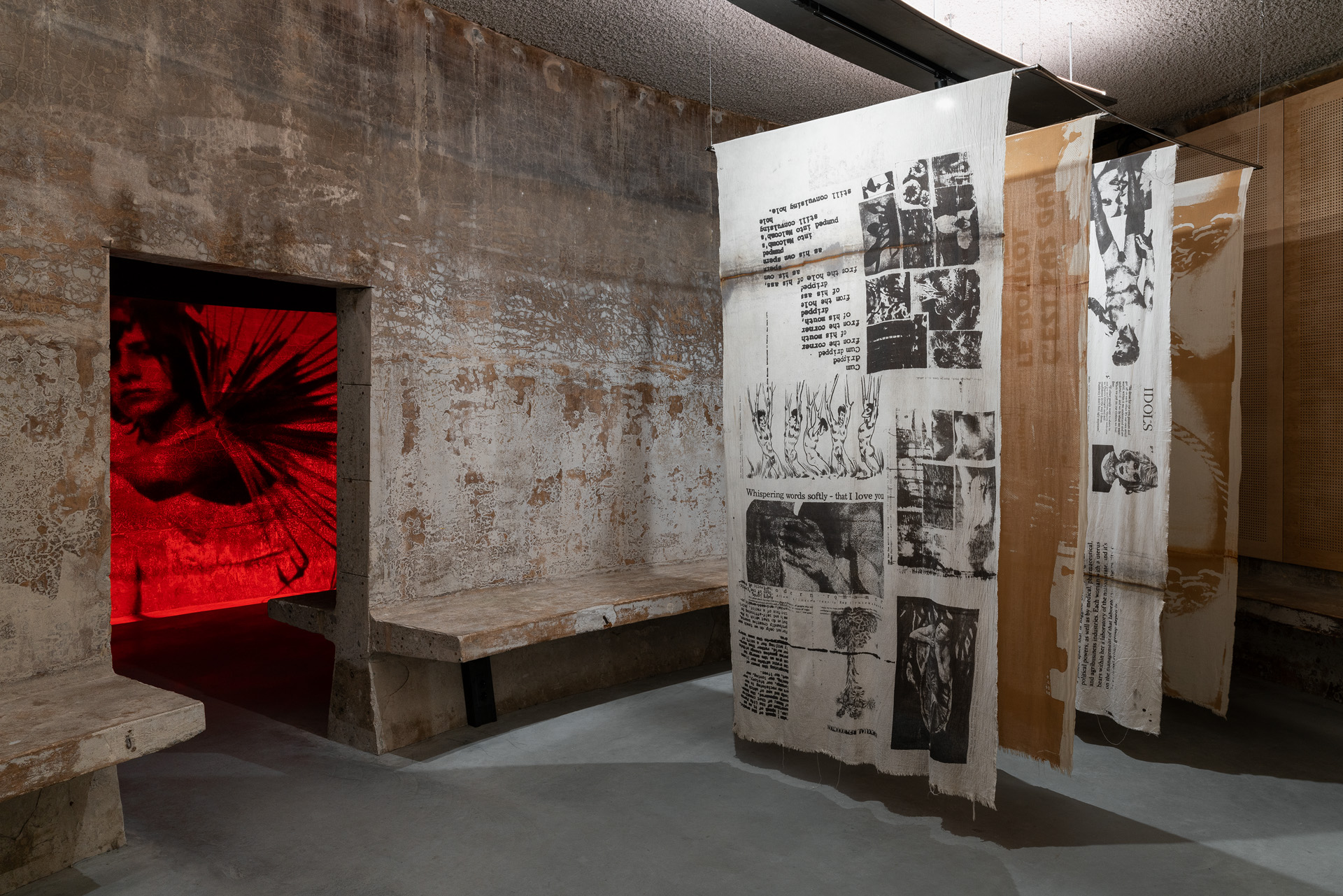 RADIUS is delighted to present BECOMING UNCOMMON SUBJECTS, an exhibition project by Werker Collective. Structured in three intersecting works for each of the three circles that shape the exhibition space of RADIUS, this exhibition displays three of the main methodologies in Werker’s practice: moving image, textile, and archive. Werker Collective operates at the intersection of labour, ecofeminism, and LGBTQIA+ movements, developing projects alongside a network of collaborators that forge intergenerational and intersectional solidarity and create alliances where to study, imagine, perform, and make art together. Founded by Marc Roig Blesa and Rogier Delfos in Amsterdam in 2009, Werker has been building an archive of manifold printed matter and moving image, comprising more than three thousand documents at present. In every project they undertake, the archive is activated via different methodologies and by different constellations of collaborators.