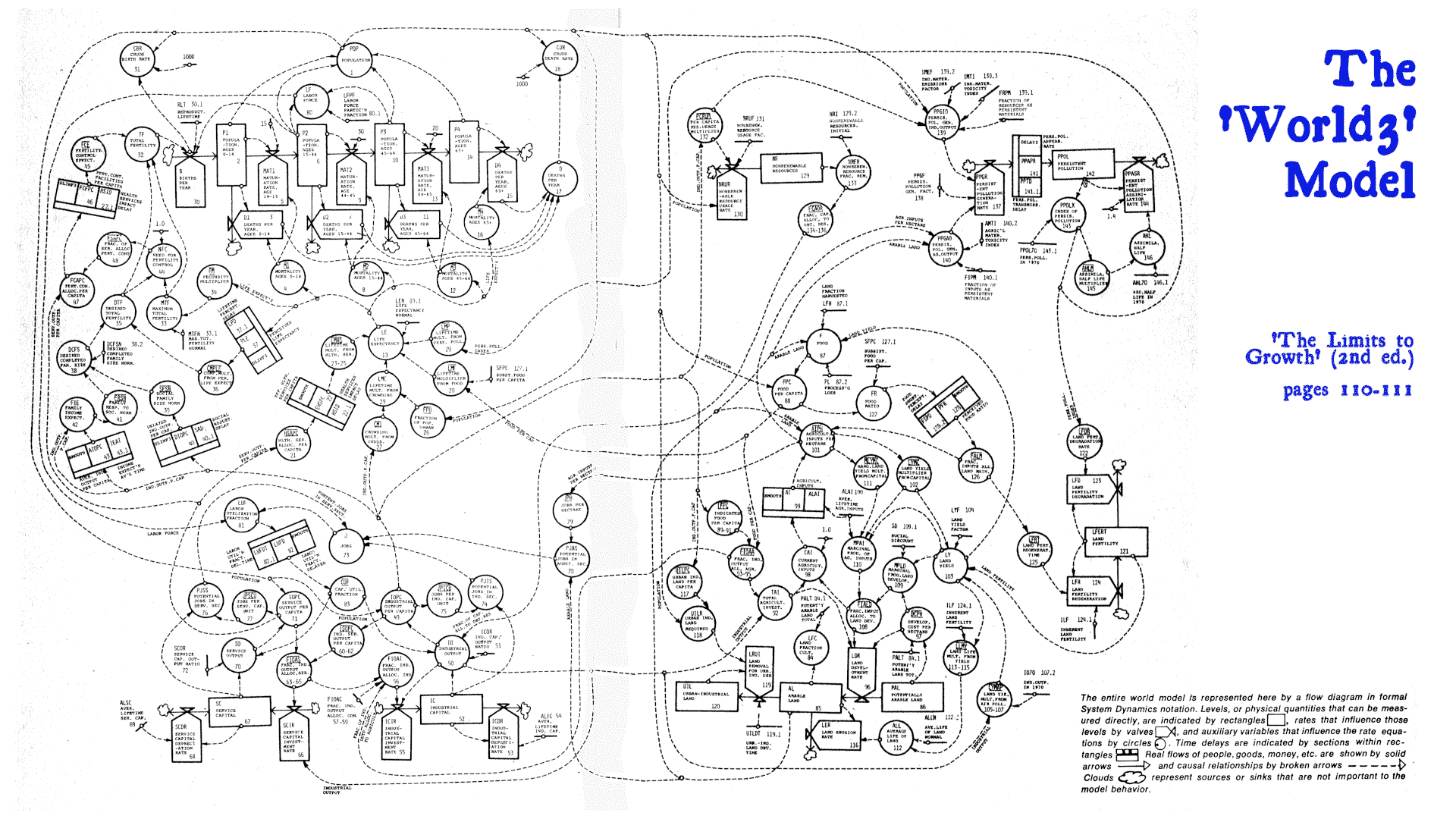 Het ‘World 3’-model is ontwikkeld door Jay Forrester van het Massachusetts Institute of Technology en vertegenwoordigt een complex model van de planeet als één enkel systeem dat de effecten en gevolgen van menselijke activiteit en materiële consumptie met elkaar verbindt.