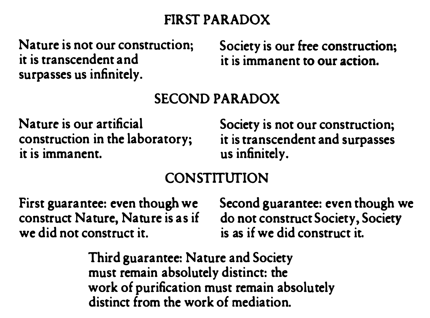 In die wetenschappelijke bemiddeling vinden we de paradox van de modernen, zoals filosoof, antropoloog en socioloog Bruno Latour het formuleert: "Door tegelijk de mediatie (bemiddeling) en de zuivering te gebruiken, maar ze nooit samen te representeren, speelden ze tegelijk de kaart van de transcendentie en die van de immanentie van de twee entiteiten natuur en maatschappij." Tekstfragment geciteerd uit Bruno Latour, We zijn nooit modern geweest. Amsterdam: BOOM uitgevers Amsterdam, 2021.