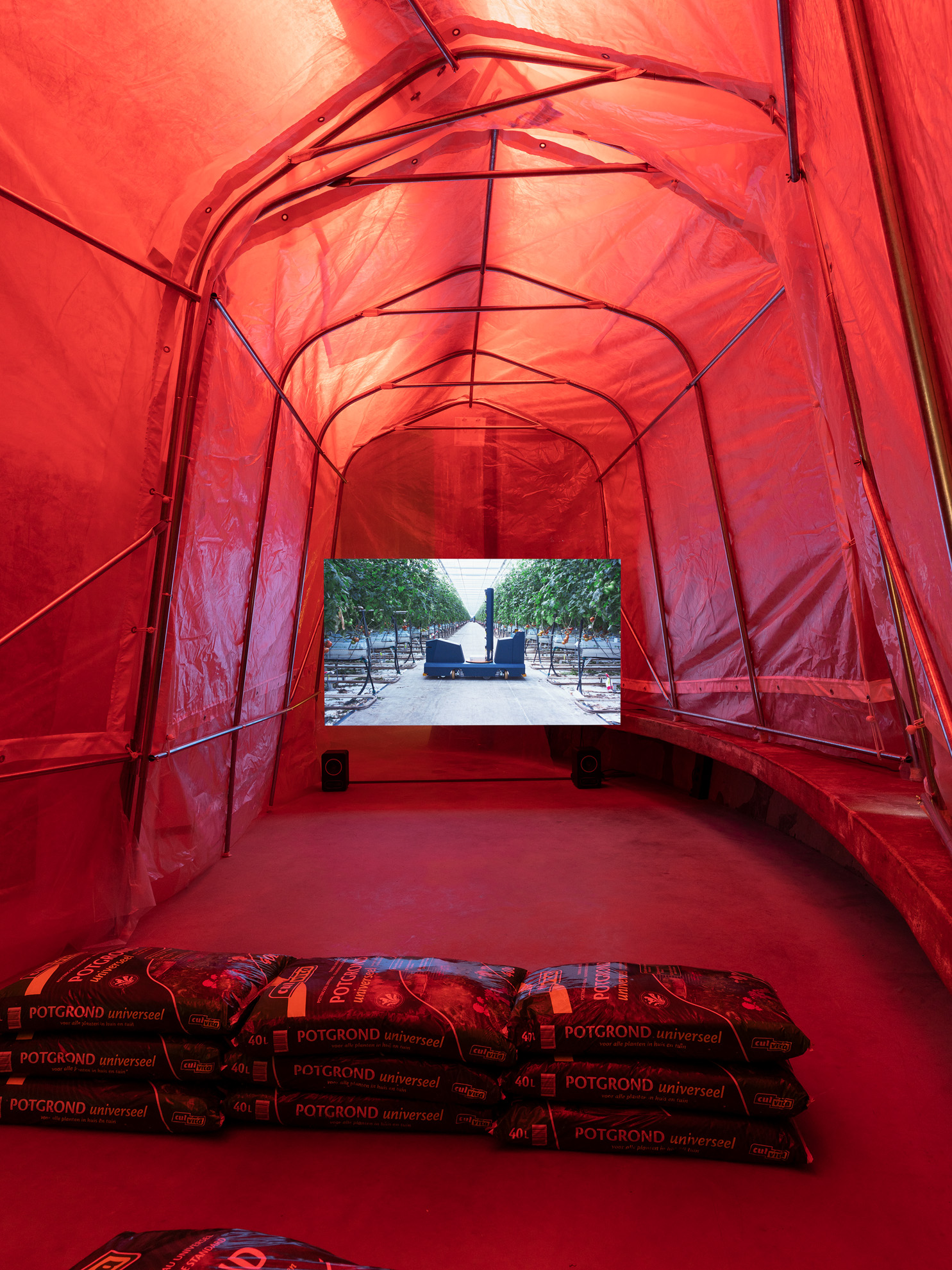 Located on the North Sea coast between Delft, The Hague, and Hook of Holland is a region where there are no seasons and the sky glows orange at night. This is the Westland: once an agglomeration of farming villages whose mild climate and clay soils made it home to grapevines and potato fields. The Westland is now the world’s largest continuous area of glasshouses, all 2,300 hectares of them. The grapes and potatoes have given way to high-tech agribusiness and intensive cultivation, mainly of fruit, vegetables, cut flowers, and ornamental plants. The exhibition THE GLASS CITY explores the Westland through the work of eight artists. It provides insights into the relationship between agriculture and technological innovation and transformation, the balance between natural and artificial, economy and ecology, and the future of food production.