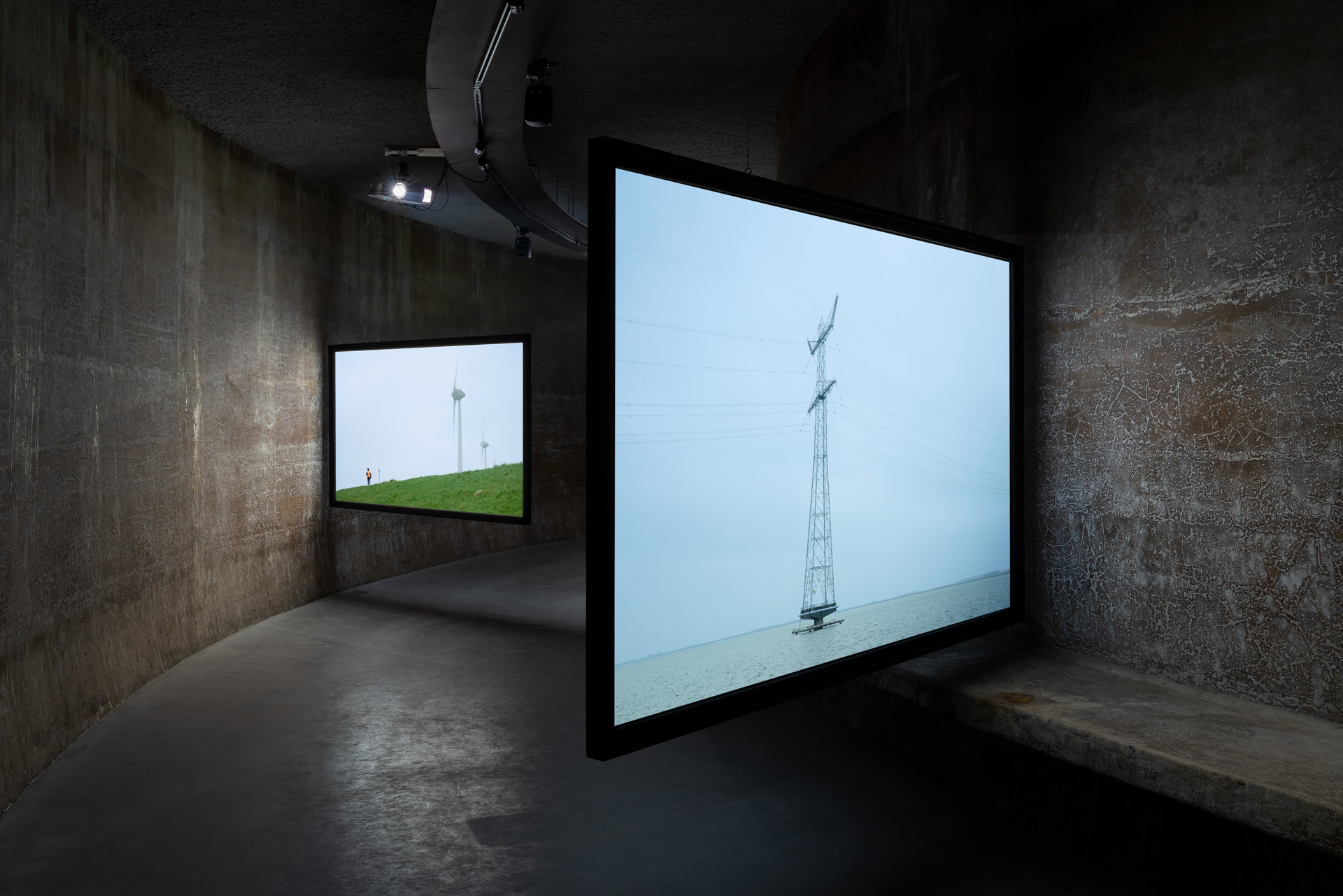 The exhibition SCENES FROM THE POLDER WESTERN is the outcome of a four-year long-term research project situated in the Netherlands, defined in relationship to the previously described interplay of land, sea, watery infrastructures, and the diverging aims, hopes and aspirations of the different stakeholders concerned. In 2020, Mata Dupont and Roux began interviewing climate scientists, sea level researchers, hydraulic engineers, artists and educators working in the field of water management, as well as people whose lives are intimately related to the sea and the land, among water millers and farmers. They spent time travelling around the country to discover the different landscapes of the Netherlands: polders, rewilded lands, farmland, artificial islands, storm surge barriers, and dykes. This early extensive fieldwork and interdisciplinary research provided the artists with new and more nuanced understandings of the Dutch landscape and its historical development.