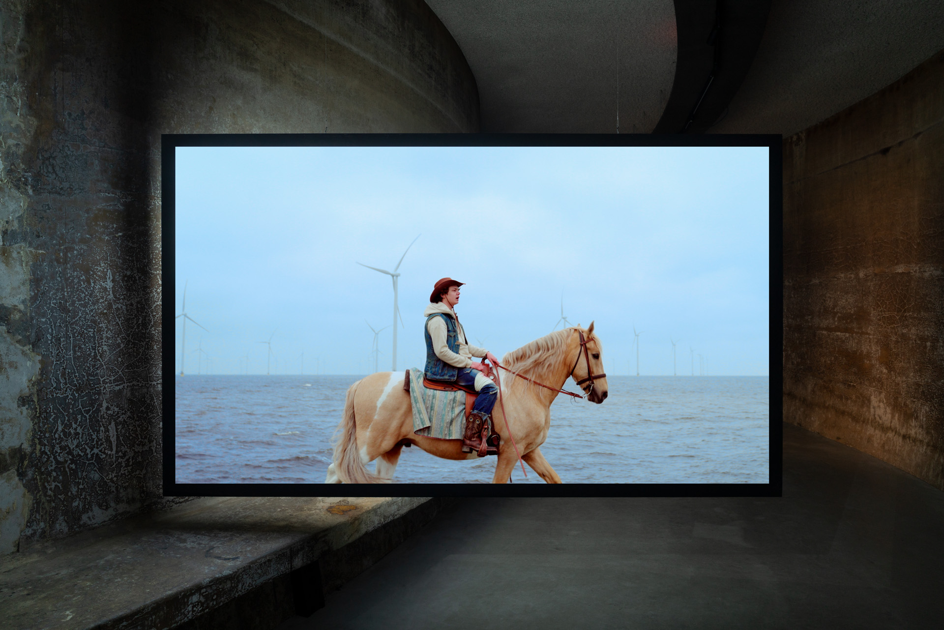 It is precisely at this increasingly thinning threshold between the sea and the Dutch polder landscape that the exhibition SCENES FROM THE POLDER WESTERN by artists Pilar Mata Dupont and Erika Roux is situated. Through a series of vignettes, informed by the cinematic tropes of the Western genre, Mata Dupont and Roux unpack a sequence of moral tales regarding an environmentally vulnerable country facing complex issues, such as climate change, sea level rise, floods and droughts, collapsing infrastructures, a nitrogen crisis, and their subsequent societal polarisation and political (mis)management. Through a tragicomic narrative, the film installation LOWLAND MELODIES, A POLDER WESTERN at RADIUS establishes arcs between different scenes and characters—human and other-than-human—each seeking to relate, in their own way, to the changes in territory, environment, and community in the Dutch culturally and politically constructed landscape.