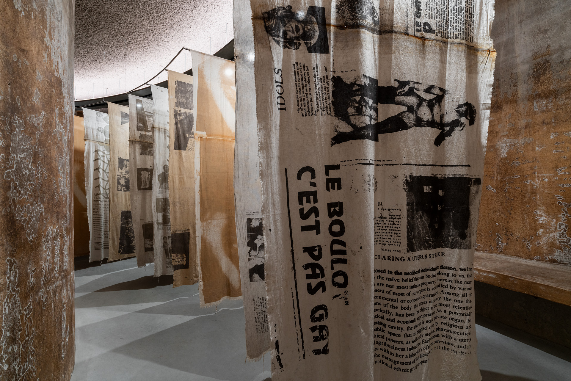 RADIUS is delighted to present BECOMING UNCOMMON SUBJECTS, an exhibition project by Werker Collective. Structured in three intersecting works for each of the three circles that shape the exhibition space of RADIUS, this exhibition displays three of the main methodologies in Werker’s practice: moving image, textile, and archive. Werker Collective operates at the intersection of labour, ecofeminism, and LGBTQIA+ movements, developing projects alongside a network of collaborators that forge intergenerational and intersectional solidarity and create alliances where to study, imagine, perform, and make art together. Founded by Marc Roig Blesa and Rogier Delfos in Amsterdam in 2009, Werker has been building an archive of manifold printed matter and moving image, comprising more than three thousand documents at present. In every project they undertake, the archive is activated via different methodologies and by different constellations of collaborators.