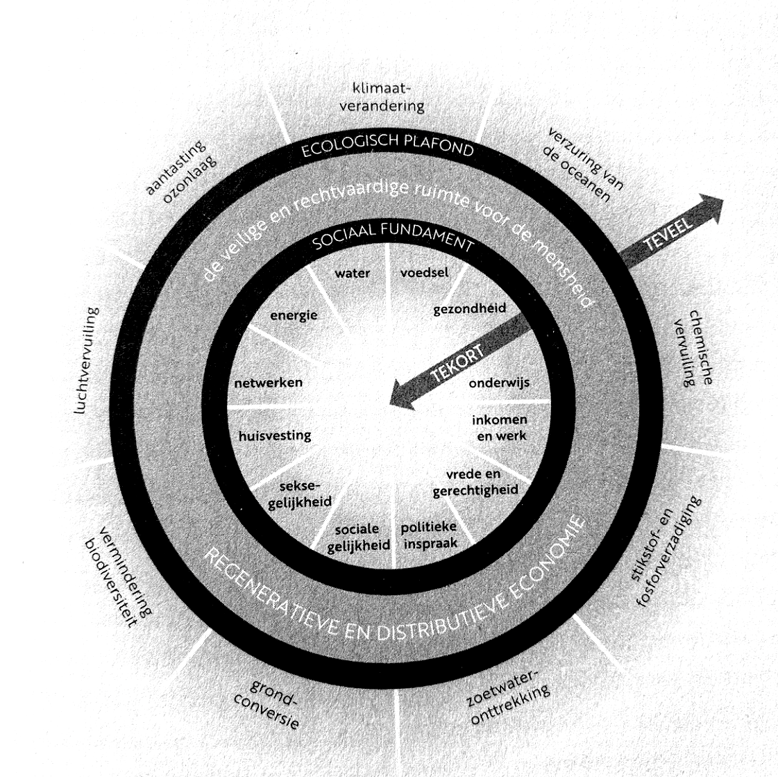 Hoe komen we op het punt waarop we in de behoefte van iedereen kunnen voorzien zonder dat dit ten koste gaat van de planeet? Deze vraag vormt de kern van het in 2017 verschenen boek Donut Economics van econoom Kate Raworth. Om goed gevolg te geven aan die vraag stelt Raworth dat we op een fundamenteel andere manier naar de economie moeten gaan kijken en onze fixatie op groei moeten loslaten. De verslaving van een kleine invloedrijke elite aan economische groei heeft namelijk geleid tot extreme ongelijkheid en een ongekende aantasting van de Aarde. Raworth pleit met haar donut-economie voor een bredere doelstelling, waarin zowel het welzijn van de mens als de planeet vertegenwoordigd zijn. Ze doet dit aan de hand van een economisch systeem waarin wordt voorzien in menselijke basisbehoeften binnen een humane, op menselijke ontplooiing gerichte samenleving, waarbij tegelijkertijd de planetaire grenzen niet overschreden worden. In de kern van de binnenste cirkel van de donut—het sociale fundament—bevindt zich menselijke ellende, onheil en rampspoed, waaronder honger, analfabetisme en sociale ongelijkheid. Aan de buitenzijde van de buitenste ring—het ecologische plafond—bevindt zich de aantasting van de planeet, zoals veroorzaakt door klimaatverandering en de biodiversiteitsafname. Tussen deze twee cirkels in bevindt zich de donut: de ruimte waarin we, binnen de mogelijkheden van de Aarde, kunnen voorzien in de behoeften van mensen en niet-mensen. Om het welzijn van mens en ecosystemen te bevorderen is het vinden van een juiste balans dus essentieel. De donut staat, concludeert Raworth, voor “een sociaal fundament van welzijn waar niemand onder mag zakken, en een ecologisch plafond (…) dat niet mag worden doorbroken”.