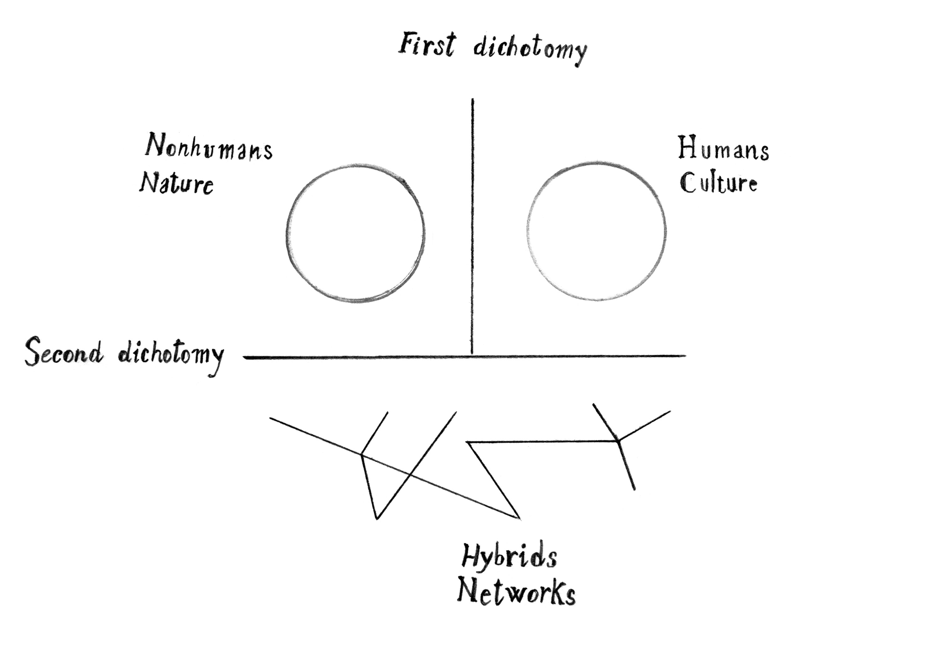 Tekening door Lisa Rampilli, gemodelleerd naar schema van Bruno Latour uit We zijn nooit modern geweest (1993).